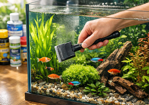 Даже при хорошем фильтре и регулярной подмене воды аквариум загрязняется: на стекле появляются налёты, на грунте оседают остатки корма, а в труднодоступных местах скапливаются органические отходы. Всё это может привести к ухудшению качества воды и росту водорослей.